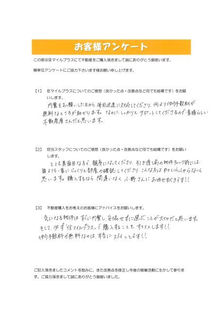 - A.とても真面目な方で親身になって下さり、引き渡し前の物件チェック時には誰よりも一番にじっくりと部屋の確認して下さり、こんな方は中々いらっしゃらないと思います。購入するなら間違いなく小野さんにお任せすべきです!!
